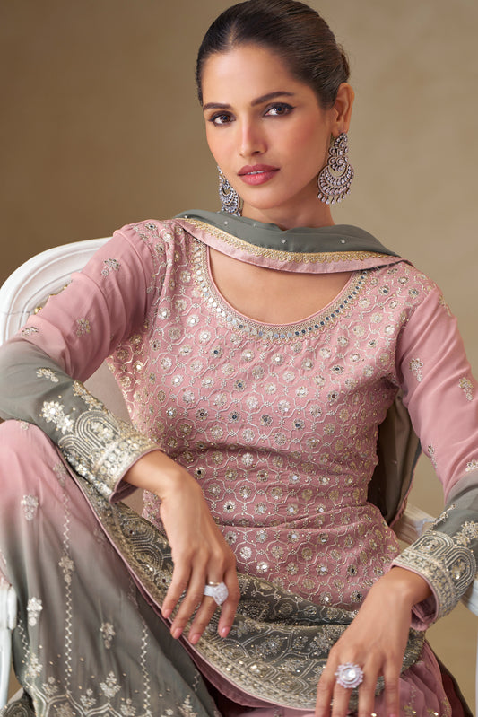 Pink & Olive Grey Embroidered Suit with Dupatta