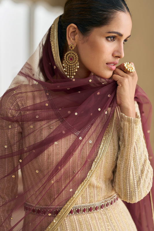 Beige Gold Embroidered Anarkali Suit with Wine Dupatta