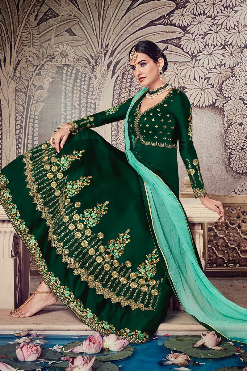 Basil-Green Floor length Anarkali Suit with nice artwork on yoke and sleeves.