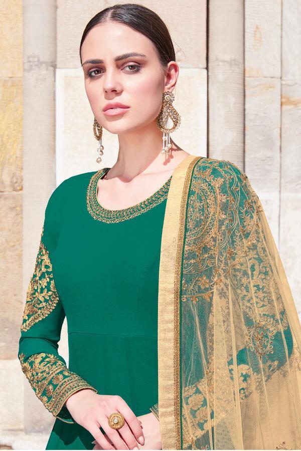Emerald-Green Georgette Party wear Anarkali Suit with Beige net duppatta