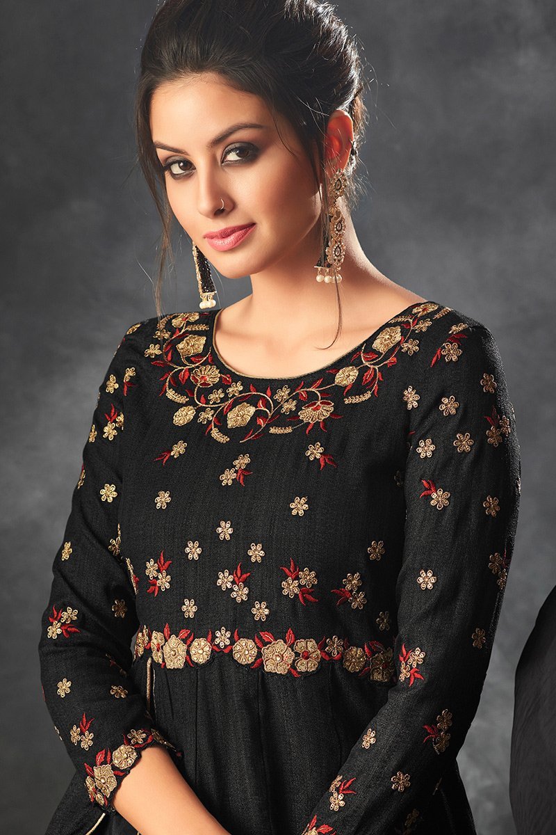 Mid-night Black color Raw Silk Anarkali Suit with Heavy Embroidery and Swarovski work on front and gold colored pining on side cute with same colored fabric on bottom of kurti gives it a majestic look.