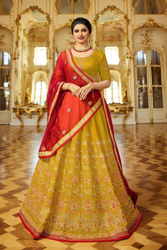 Mustard Yellow sparkle silk heavy embroidered Lehenga Set. The Silk Lehenga Set is beautifully weaved together with Heavy yet elegant embroidery all over intricate with stone and sequins work.