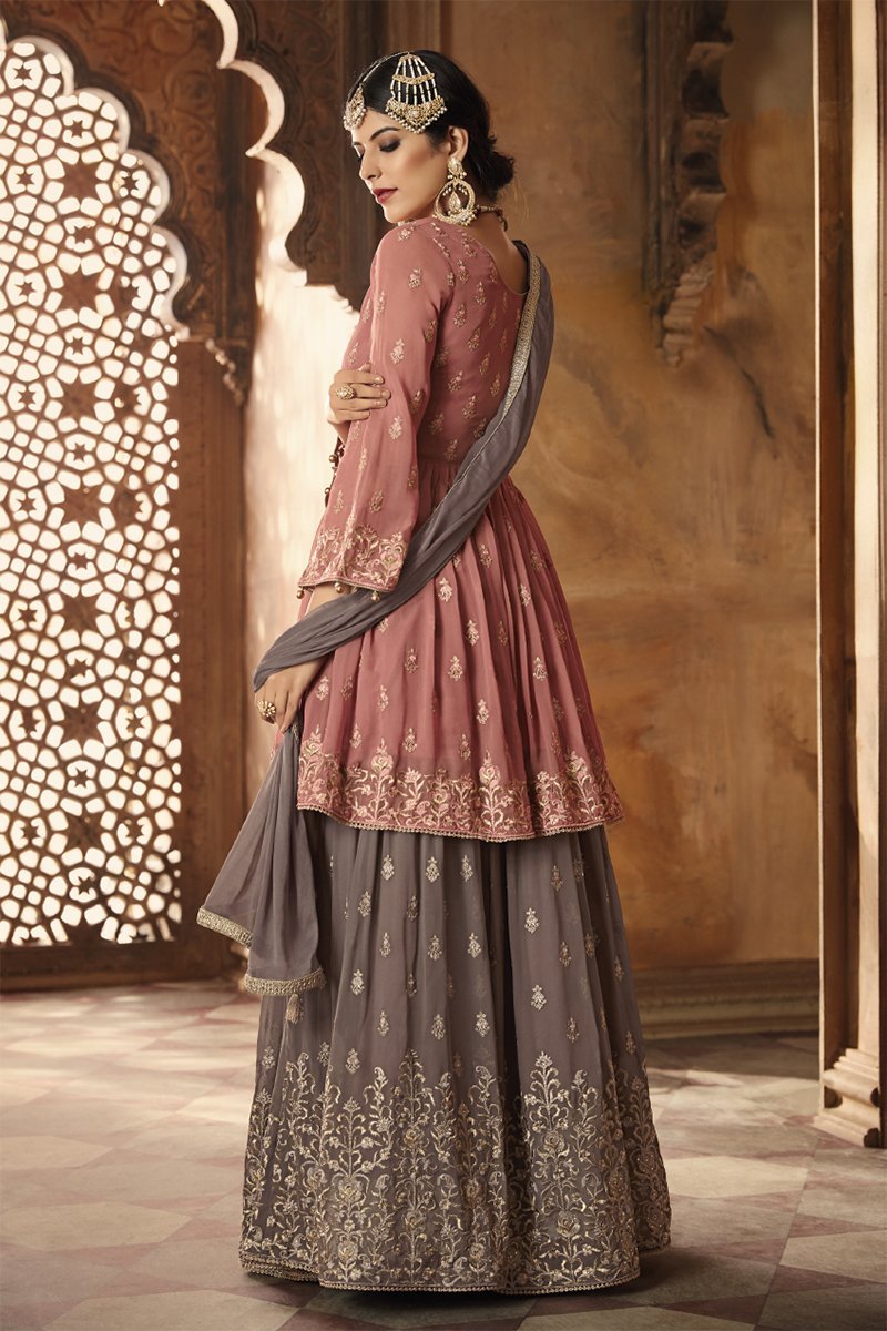 Pink Blush With Mauve Embroidered Gharara Suit is specially crafted for showcasing glamorous style and ethnic elegance. This Garment features a beautiful traditional zari and thread embroidered peplum style georgette with santoon lining top paired with georgette gharara bottom and shimmering contrast chiffon dupatta which adds more glam to this ethnic wear. This ethnic suit is a must-have in every woman's wardrobe.