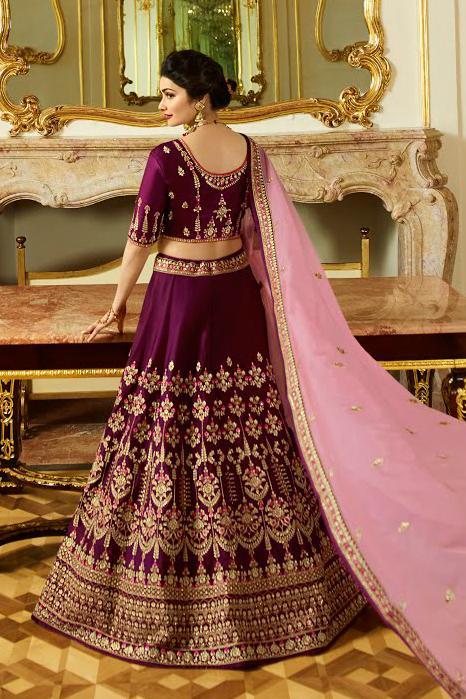 Purple sparkle silk heavy embroidered Lehenga Set. The Silk Lehenga Set is beautifully weaved together with Heavy yet elegant embroidery all over intricate with stone and sequins work.