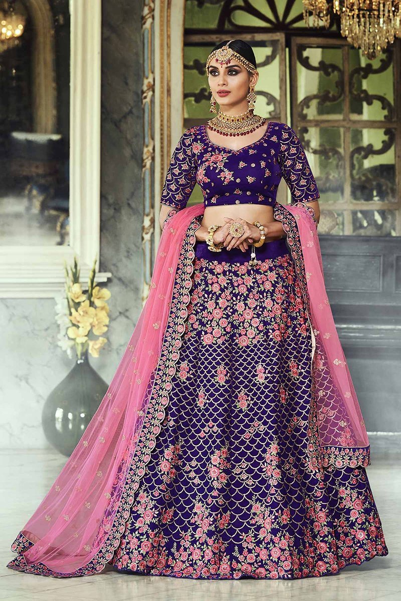 Make a Luxurious statement with this gorgeous Purple Velvet Party Wear Lehenga Choli. The Lehenga Set is beautifully weaved together with Embroidery And Handwork which gives it a Breathtaking look. The lehenga set is paired with a Purple Velvet Embroidered Blouse and Pink Net Dupatta adds more definition to the beauty of this ethnic lehenga set.