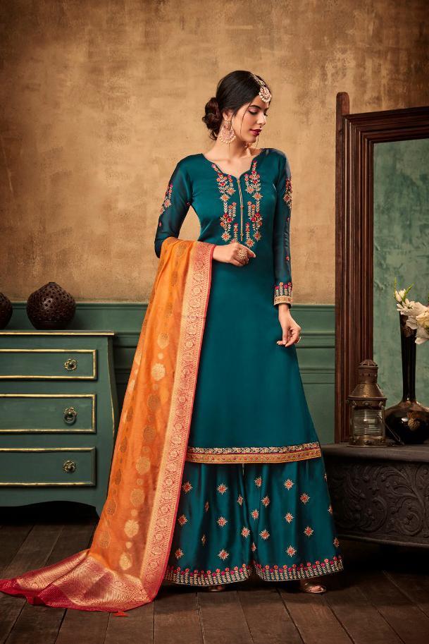 Sapphire Blue and Peach Georgette Embroidered Sharara Suit is specially designed to complement your alluring beauty. This suit set comprises a beautiful traditional embroidery and Stone Work on straight cut satin georgette kurta. This ethnic party wear comes with Full flared and embroidered Sharara bottom with Beautiful Peach banarasi dupatta which adds more glam to this ethnic party wear.