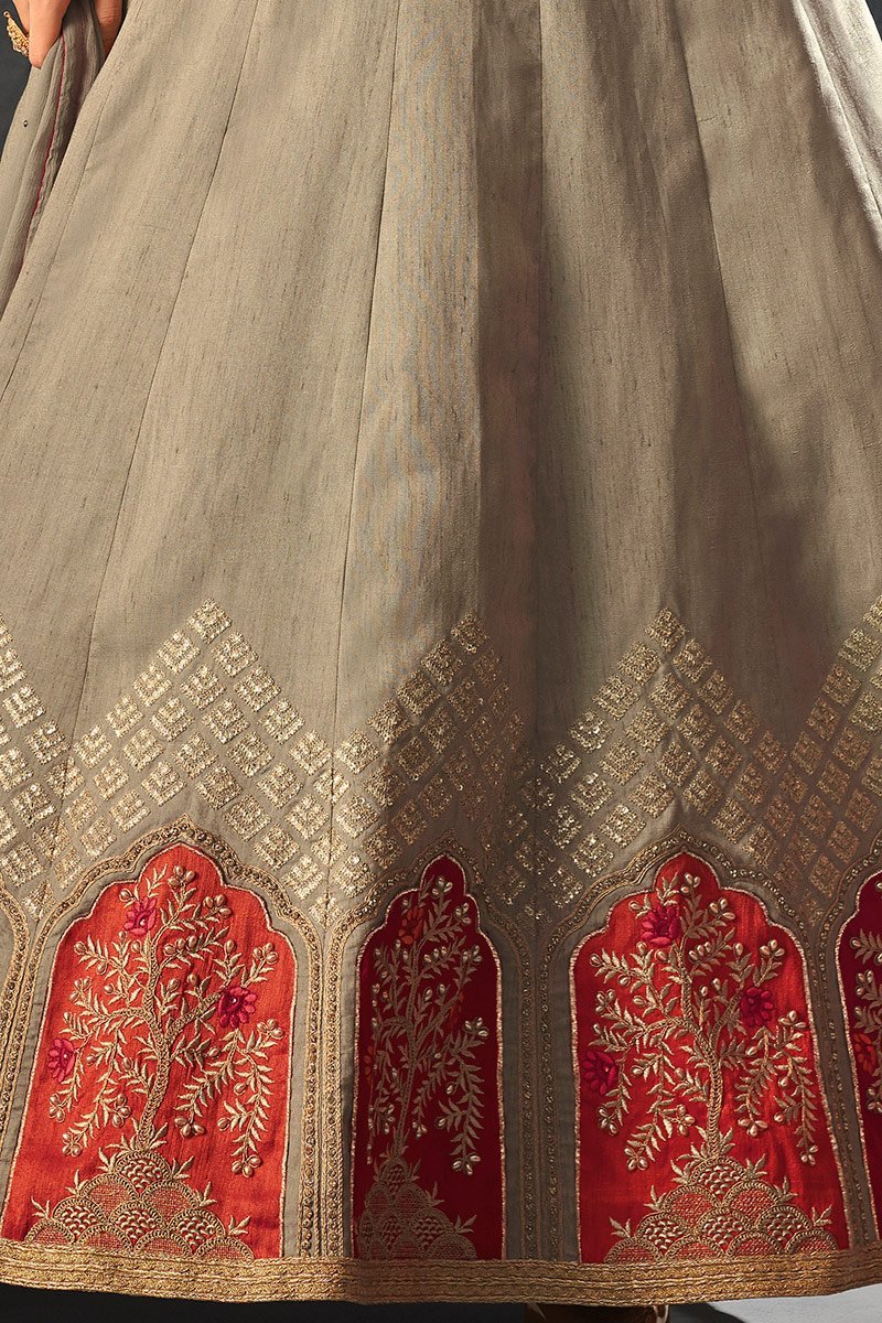 Tortilla-Brown color Raw Silk Anarkali Suit with Heavy Swarovski work on front and the maroon piping on neckline and same colored button on neck area look beautiful and traditional artwork on Skirt gives its a elegant look.