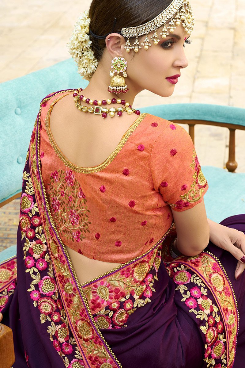 Wine Berry colored Silk Saree with elegant pink thread work and traditional embroidery on border and pallu. The Pink colored Silk blouse with same traditional artwork beautifully compliment it