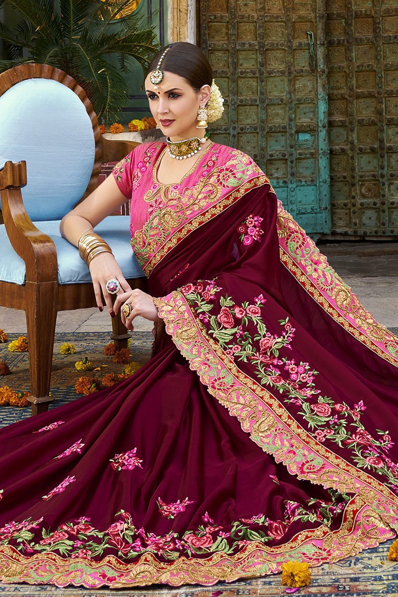 Wine colored Silk Saree with elegant pink thread work and traditional embroidery on border and pallu. The Flamingo Pink colored Silk blouse with same traditional artwork beautifully compliment it