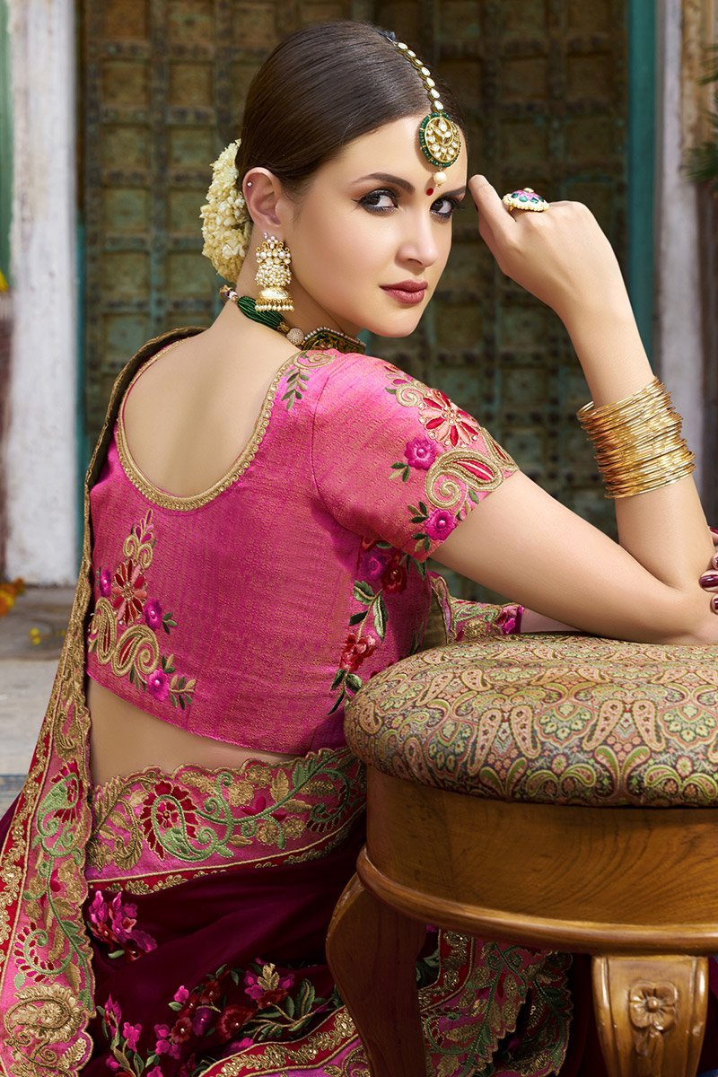 Wine colored Silk Saree with Flamingo-Pink Blouse